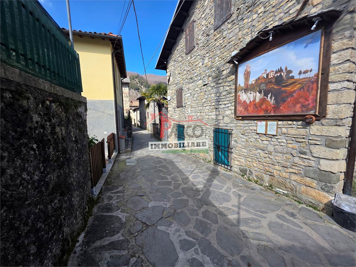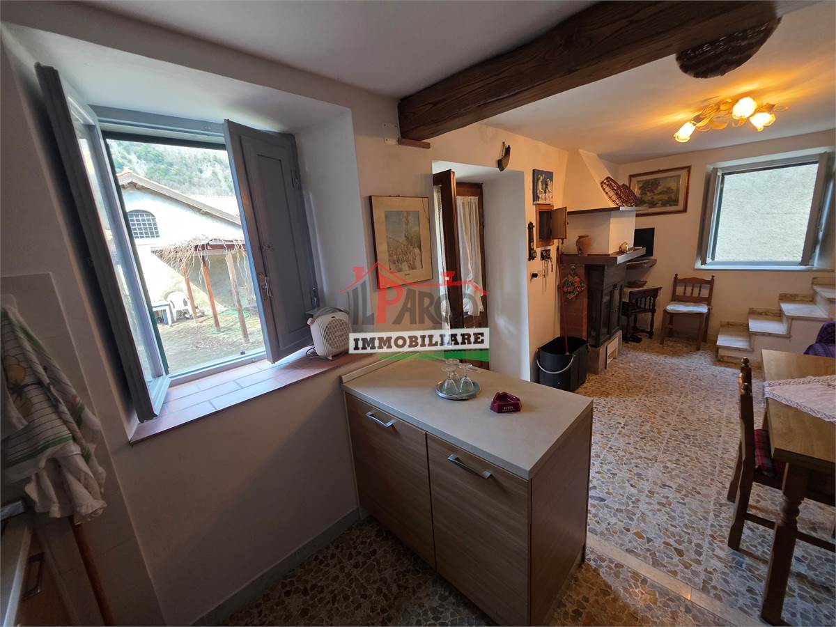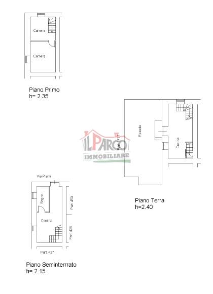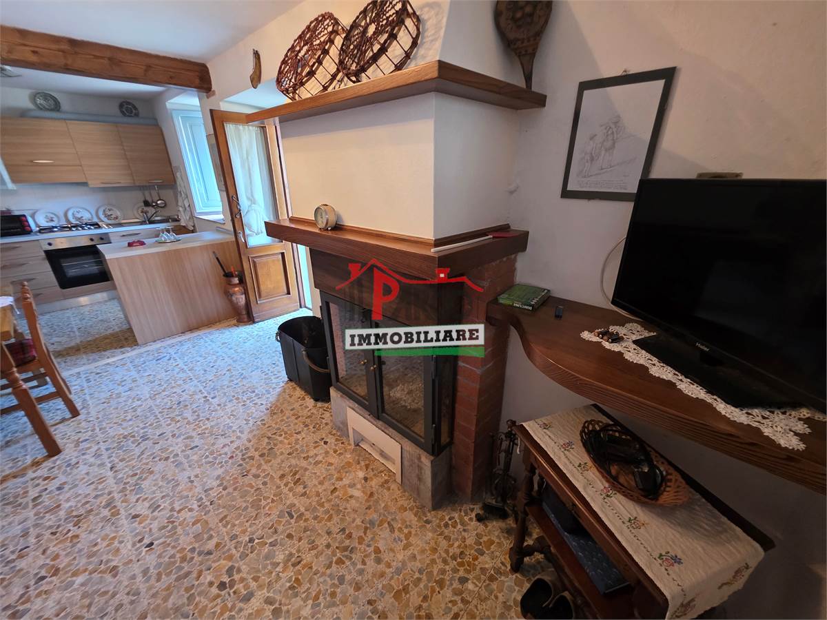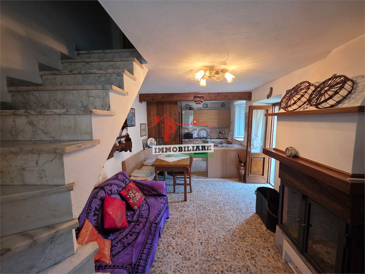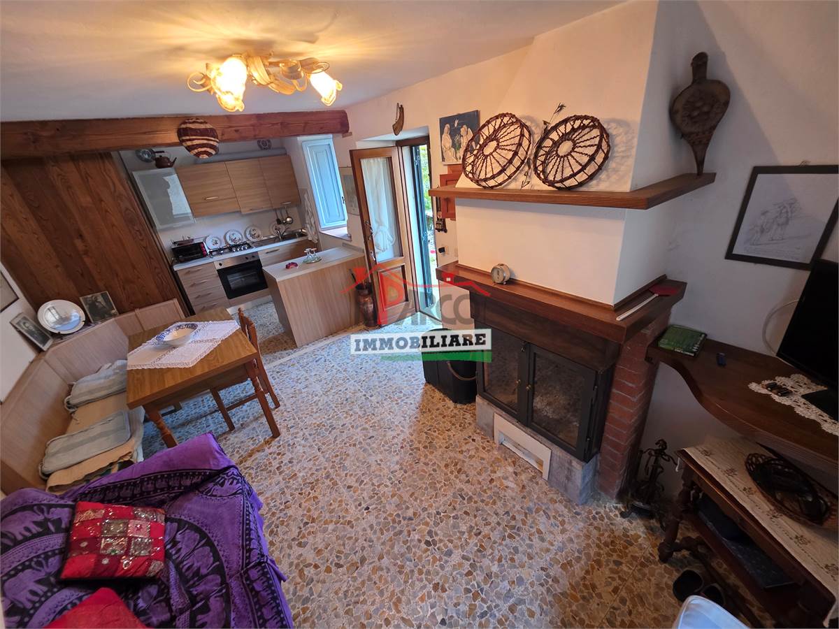 L’immobile si compone di cucina e soggiorno con camino (open space) al piano terra; due camere al piano primo e cantine e bagno al piano seminterrato.